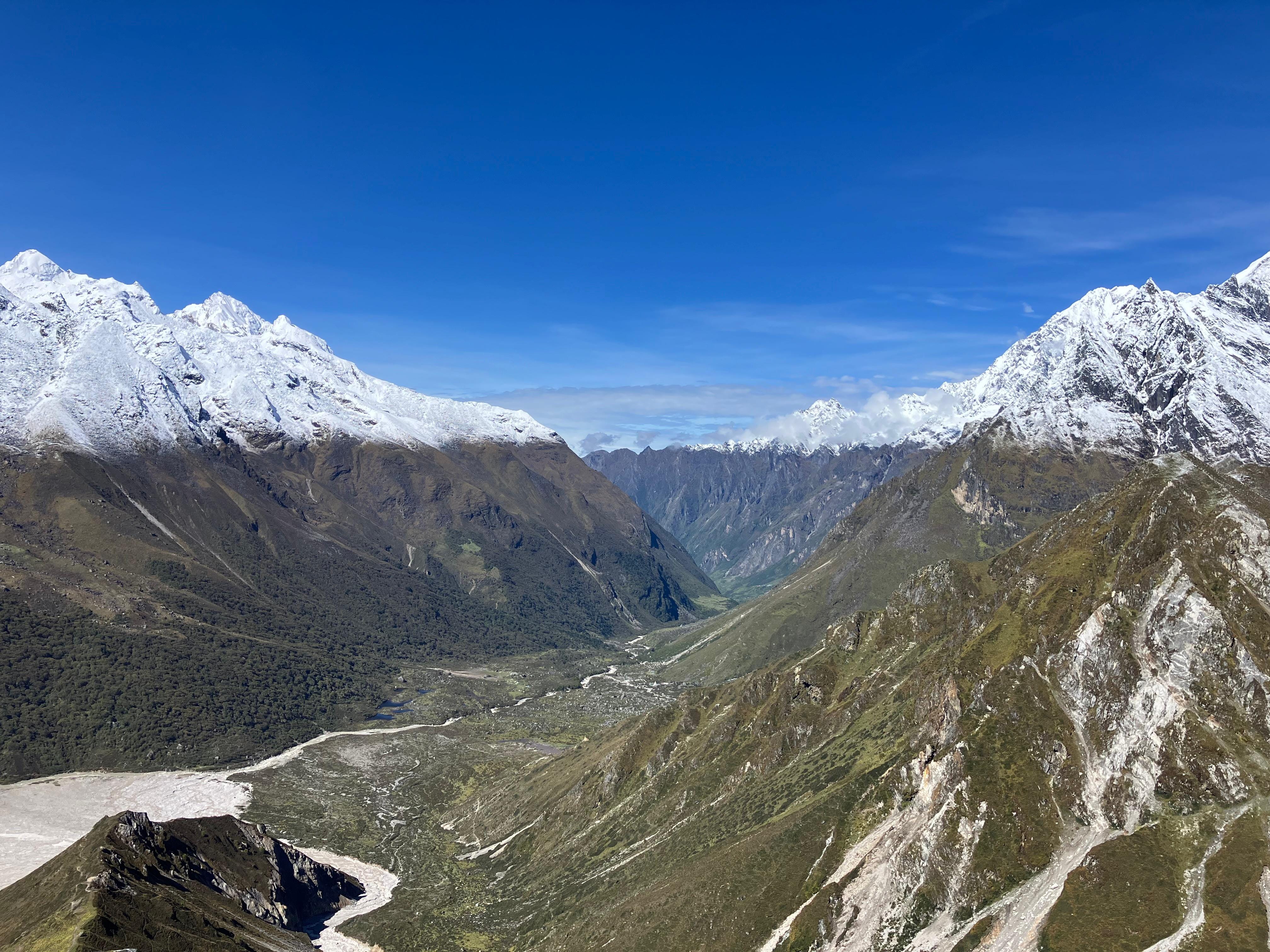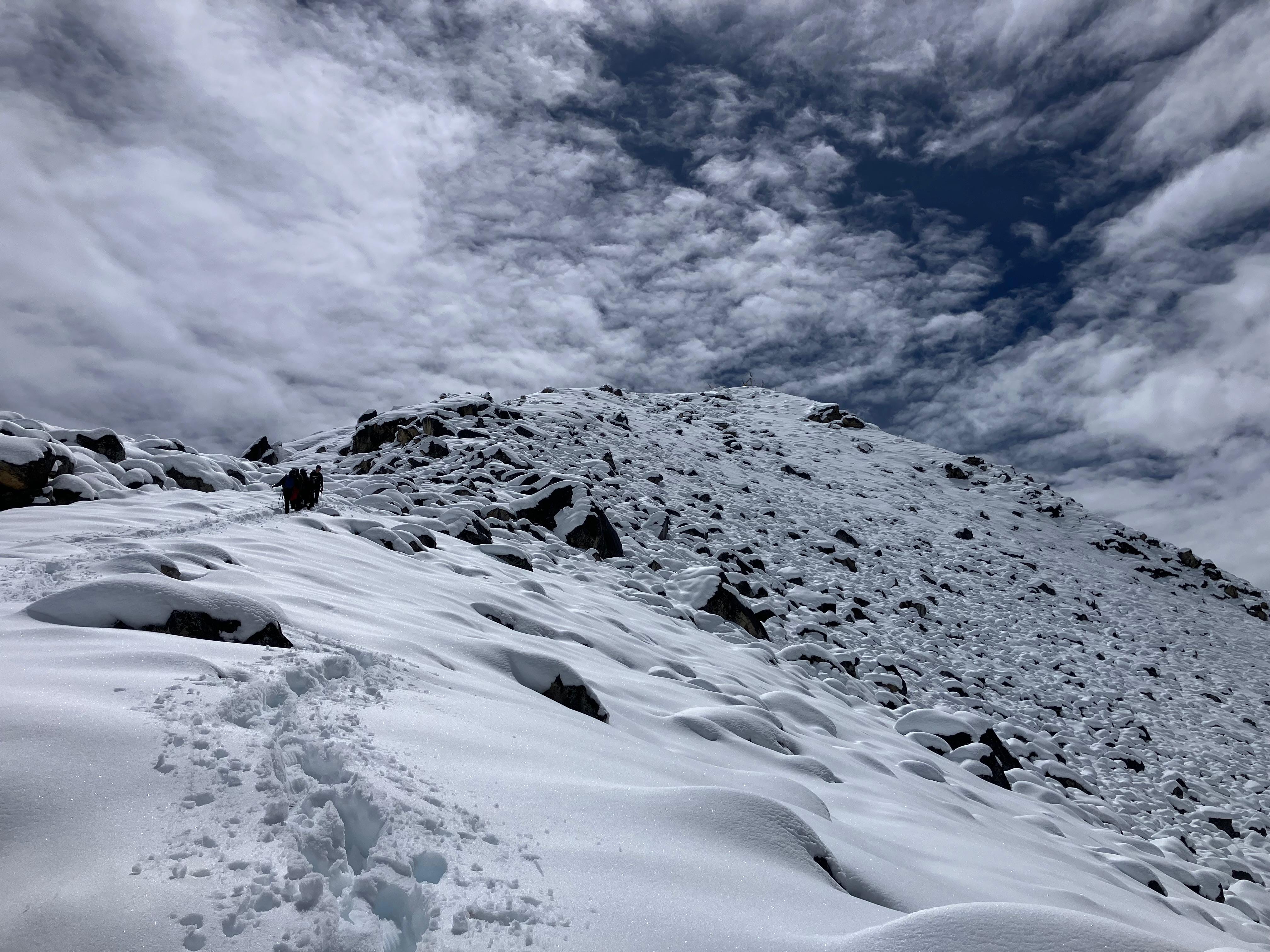 After 48 hours of continuous rain, we awoke to a beautiful clear morning, and the peaks that surround the valley were finally revealed, radiating with a blanket of fresh snow. Today was the day to climb Tserko Ri (4985m), a small peak that sits above the village. I left with my companions from the teahouse, but soon left them behind as we reached the snowline. After overtaking a few more groups, I started breaking the trail myself, which got slower and more taxing as I ascended. Near the top, I reached a huge boulder field, now covered in almost a metre of snow. A few German hikers caught up with me, and we took it in turns leading through the white maze. About 100 metres beneath the summit, we came to a stop, and after a quick discussion agreed that with the perilous gaps between the boulders completely obscured, the risk of injury was getting a little too high. As always, I'm happy to turn around when conditions dictate, so I retraced my steps as the sound of regular avalanches and rockfalls echoed from the next side valley.